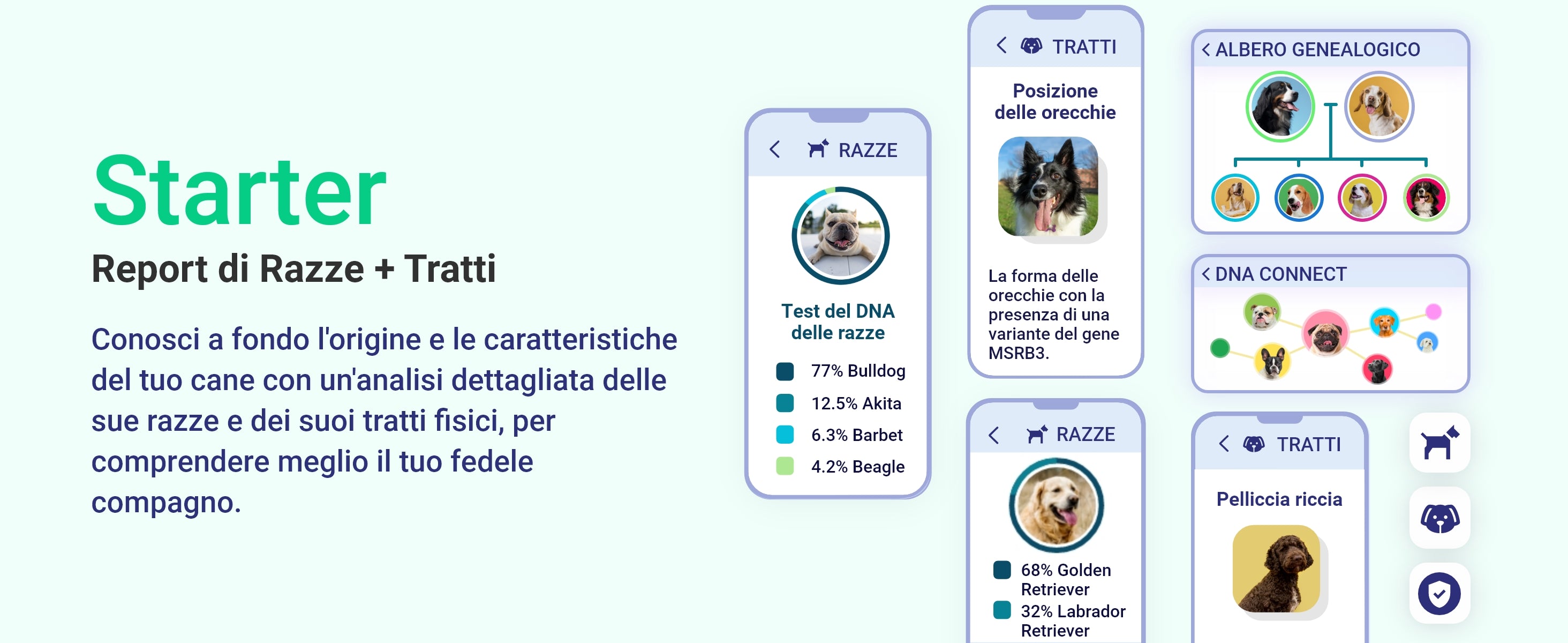 Acquista il test del DNA per cani Starter per ottenere informazioni sulle razze e le caratteristiche fisiche che i geni del tuo cane desiderano condividere. Entrambi avrete accesso a: