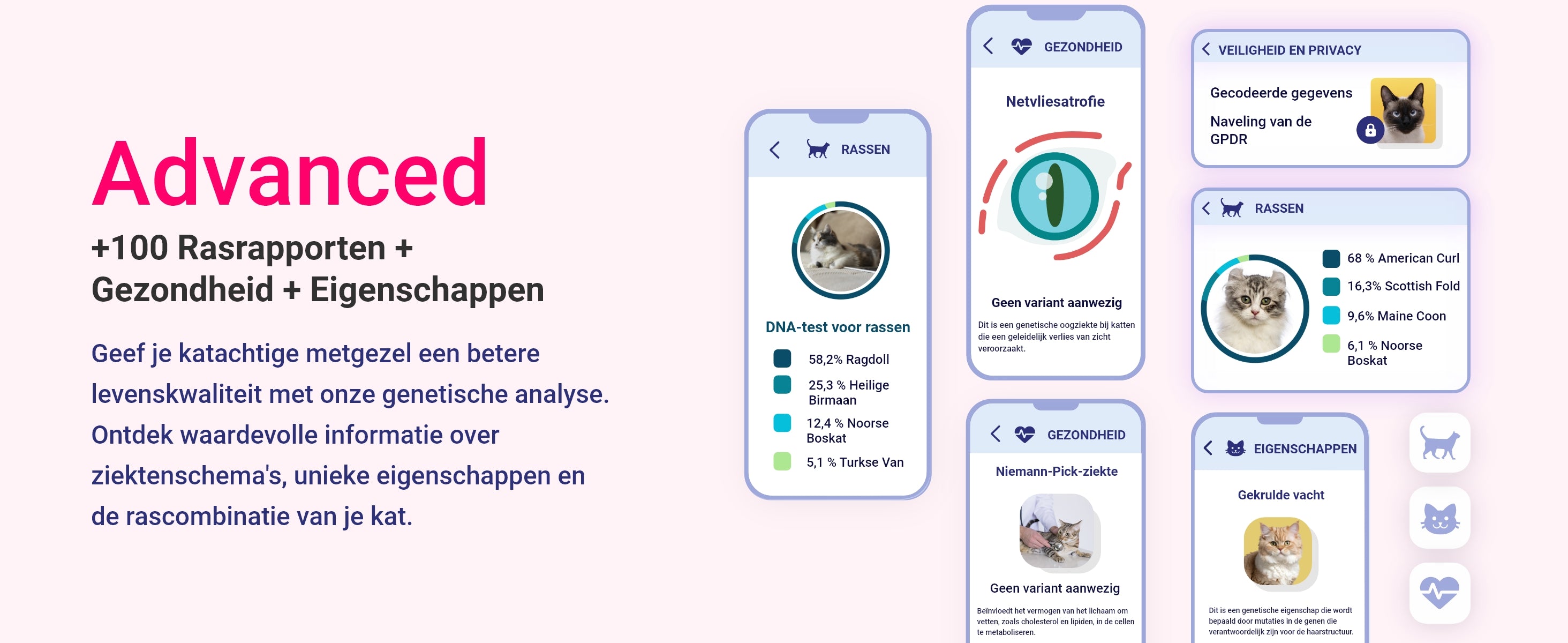 • Een lijst met meerdere ziekten en de aanwezigheid of afwezigheid ervan bij je huisdier. Je zult met zekerheid weten of je kat drager is van een ziekte of zo schoon is als na zijn drie uur durende wasbeurt.