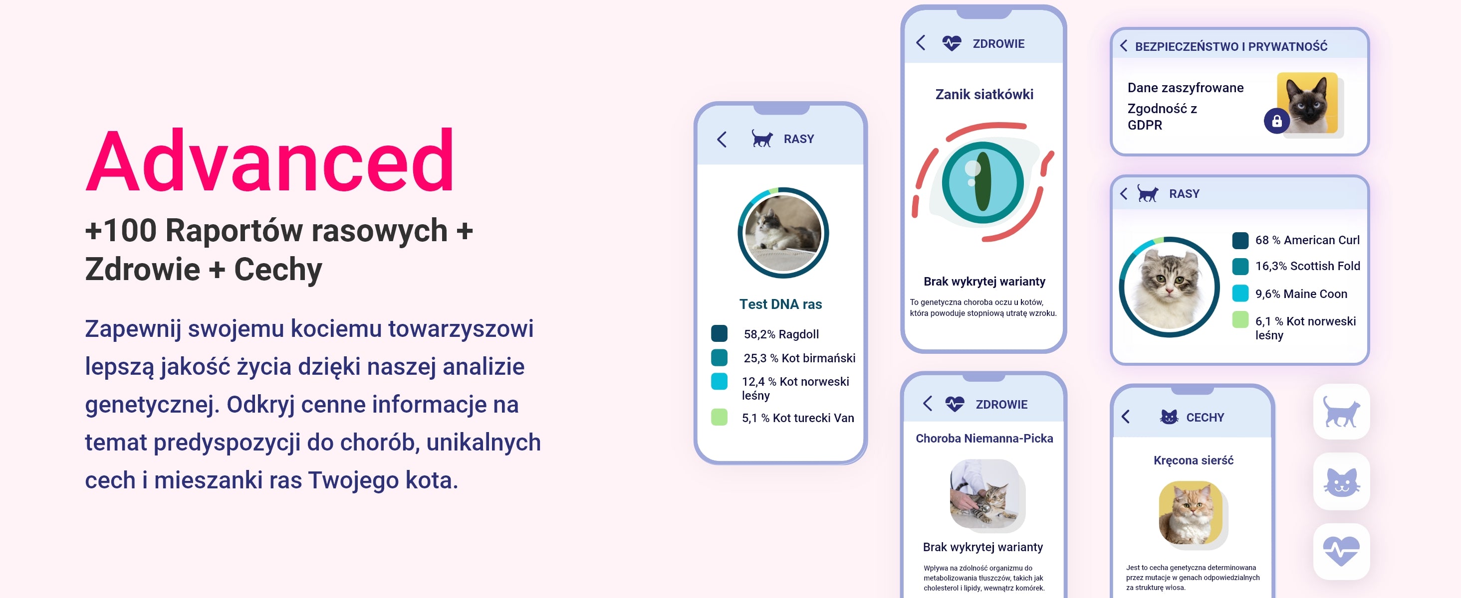 Dostarczamy ponad 145 raportów genetycznych dotyczących zdrowia, cech fizycznych i ras Twojego zwierzaka.
