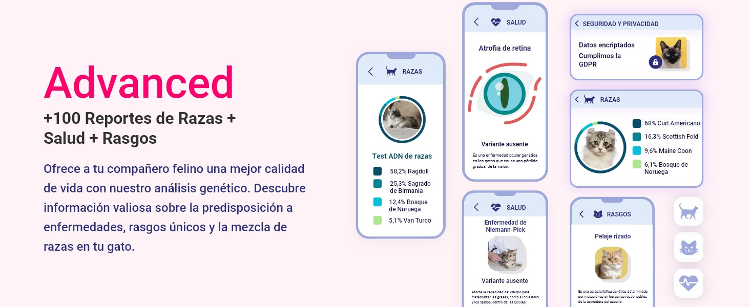 Adquiere la prueba de ADN para gatos Advanced para obtener información sobre razas y características físicas que los genes que tu gato están deseando compartir. Ambos accederéis a: