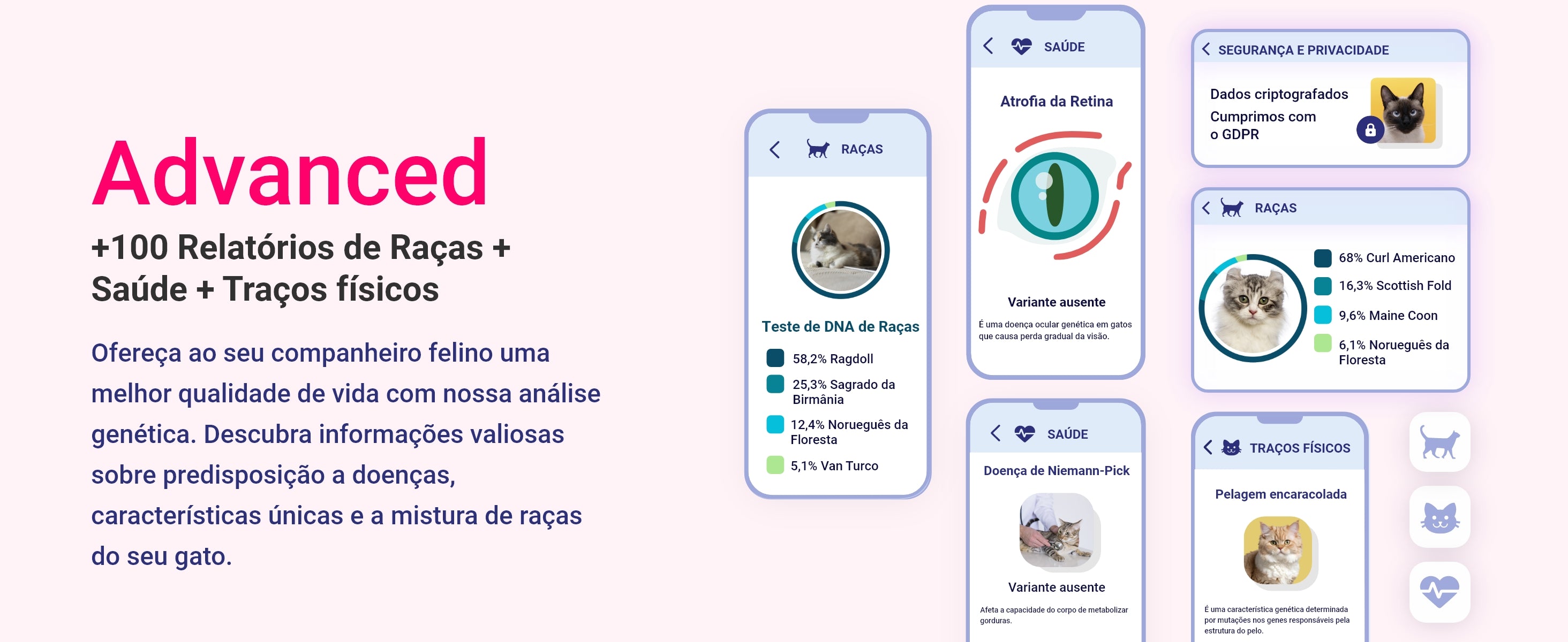 Fornecemos-lhe mais de 145 relatórios genéticos relacionados com a saúde, traços físicos e raças do seu animal de estimação.